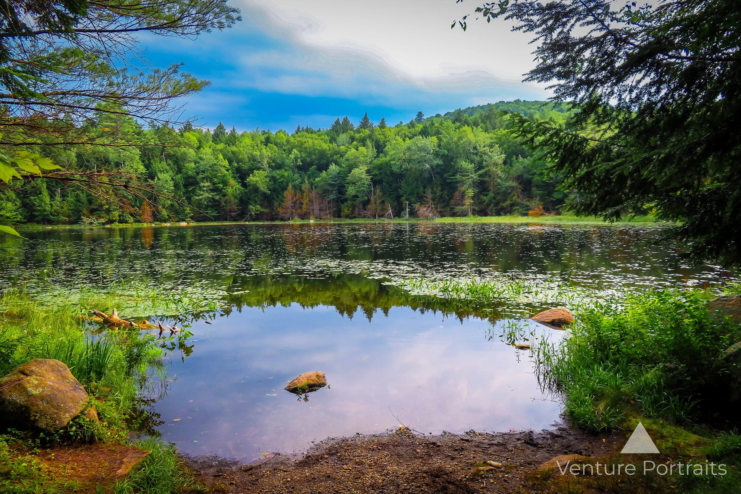 "Refuge at the Edge" was captured in the Pharaoh Wilderness Area of the Adirondacks, where still waters meet the quiet shelter of the forest. The glassy pond reflects the summer-green canopy, framed by mossy rocks and overhanging branches, offering a moment of perfect solitude.